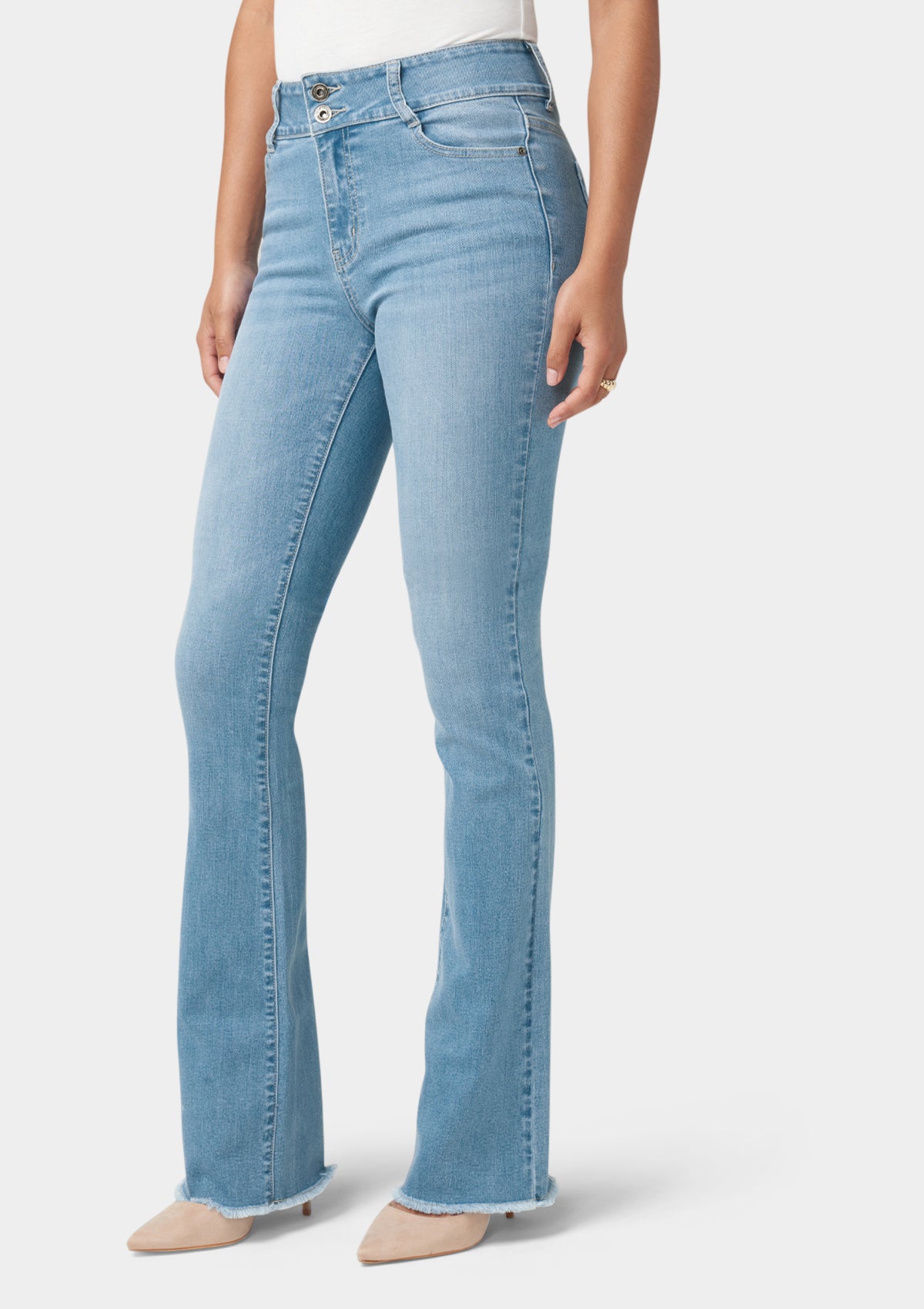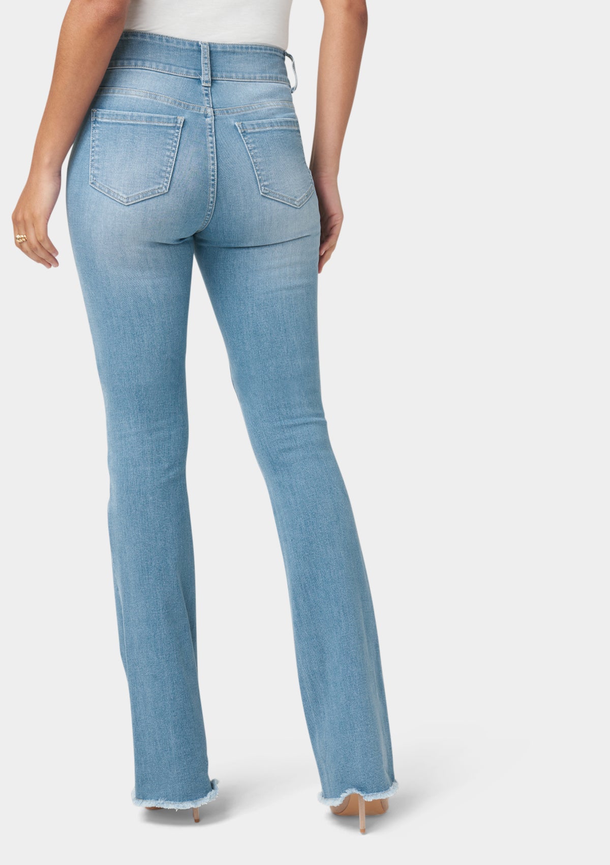 Fashioned from faded stretch denim, The Kellie Bootcut Jean is the new must have! These figure-balancing bootcut jeans feature a mid rise fit, faded thighs, 2 button closure, and distressed raw floor-grazing hems. Be sure to stand out in your new jeans.