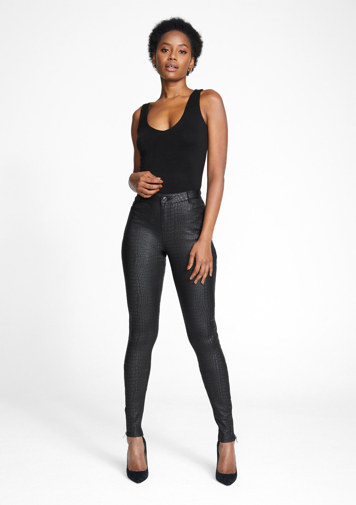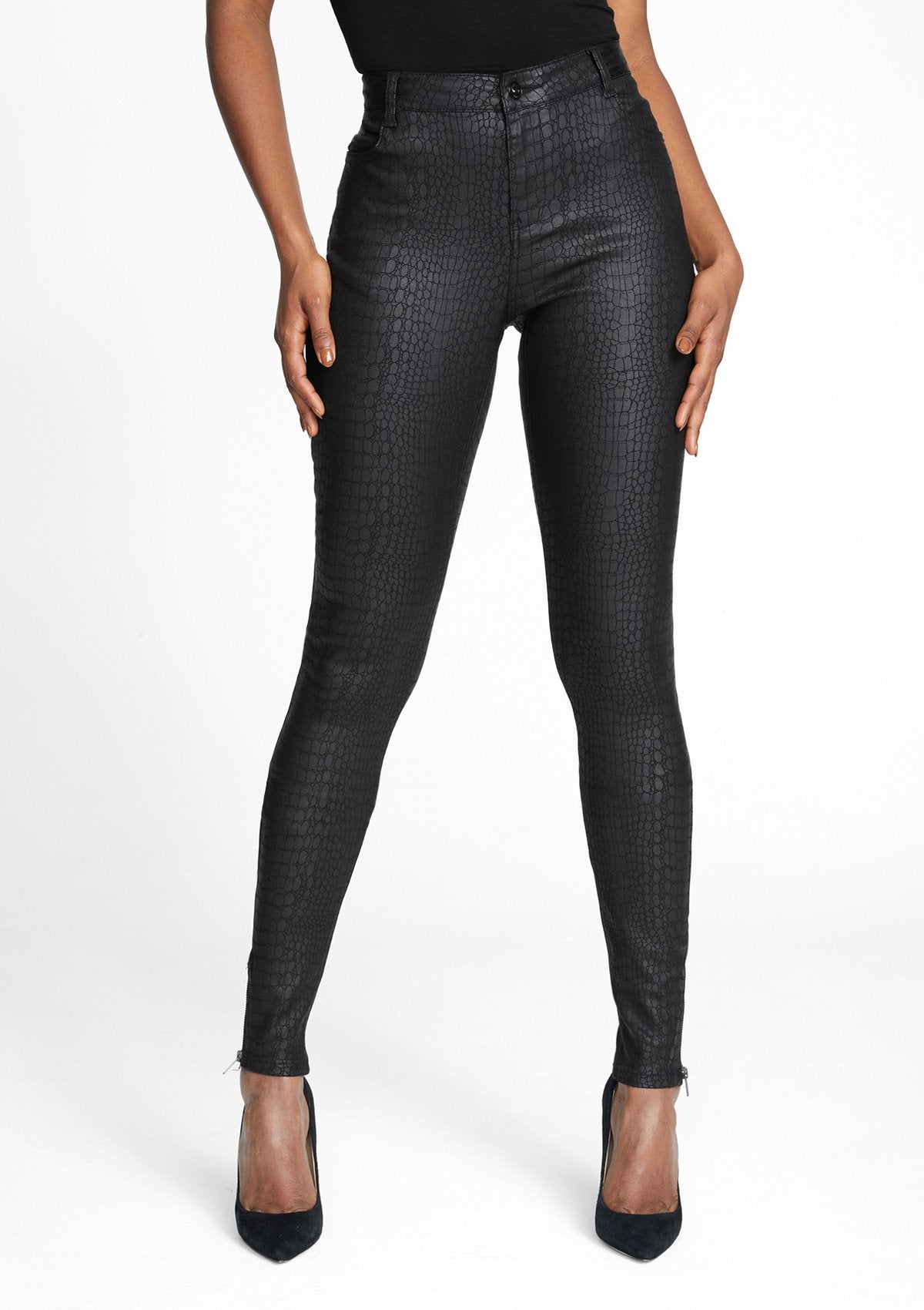 Be sure to stand out with these textured faux leather skinny pants! These hot new pants feature a subtle snake embossed print with a half zip ankle detail, high rise waist, buttery stretch material, and a 4 pocket design. These pants will contour your body and move with every step.