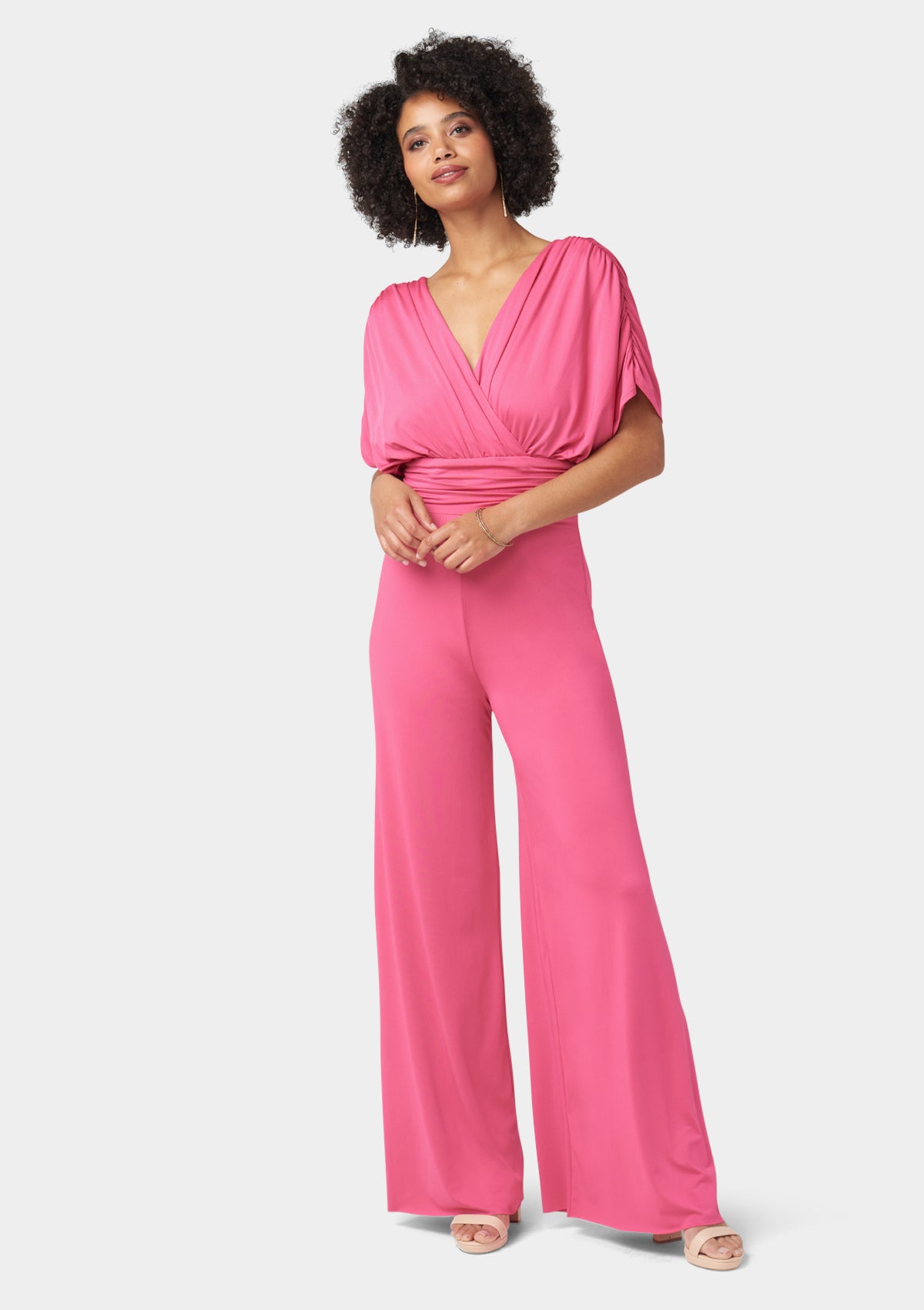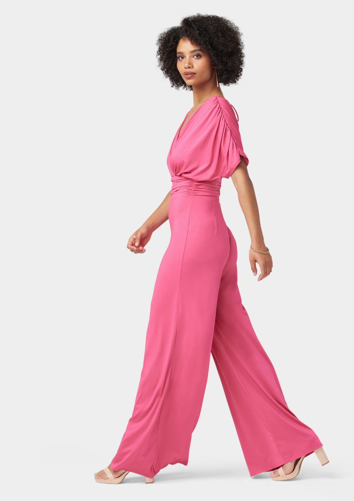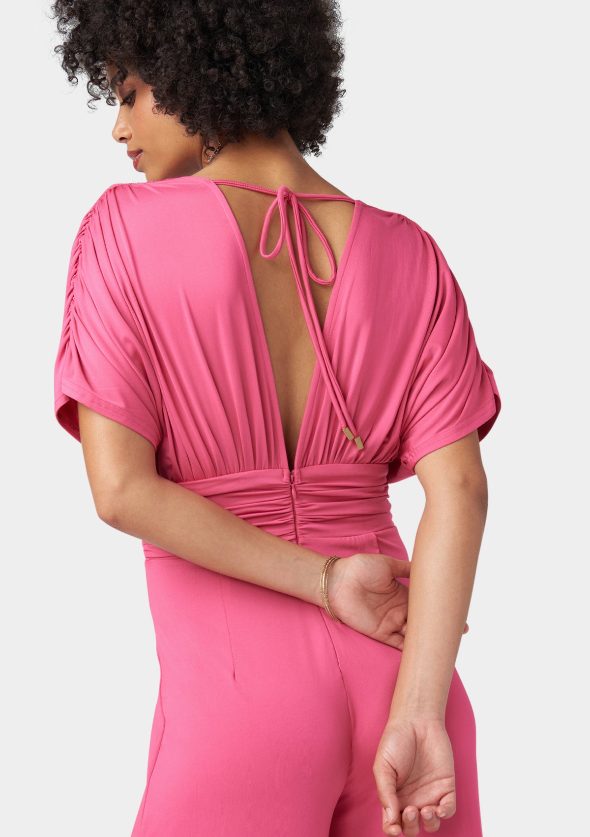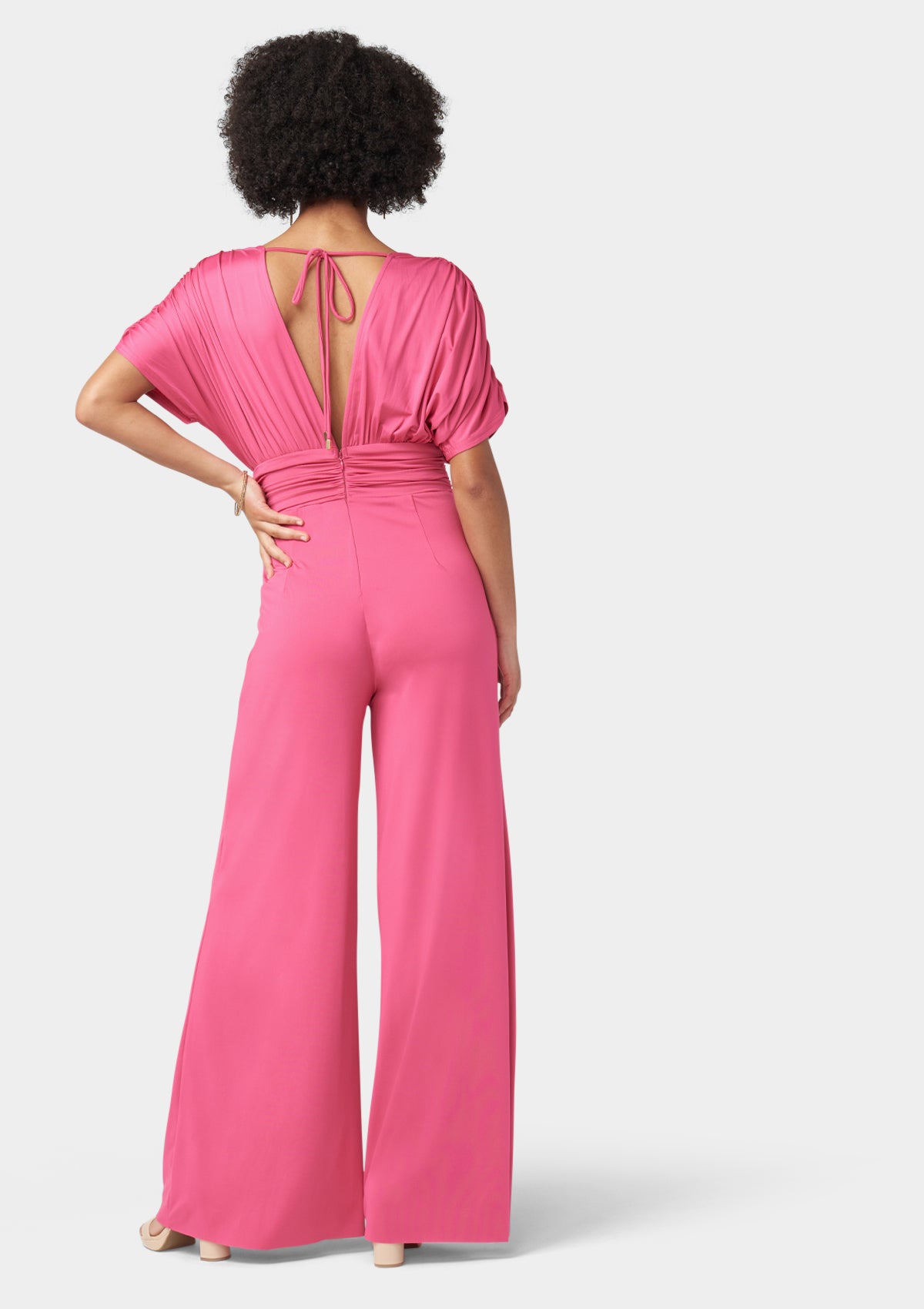 Introducing the Hampton Jumpsuit, a stunning piece that is sure to turn heads at any event. Made from a slinky buttery fabric, this jumpsuit drapes beautifully on the body and feels luxurious to wear. This jumpsuit features beautiful rouching on the shoulders and sleeves, adding a touch of elegance and sophistication. The surplice neckline creates a flattering shape that accentuates the bust, while the cinched waist cinches in at the smallest point of the waist for a feminine silhouette. The v-cut back with tie detail and hidden zipper adds a touch of allure, while the wide flowy hems create a beautiful and effortless flow as you move. Perfect for formal occasions.
