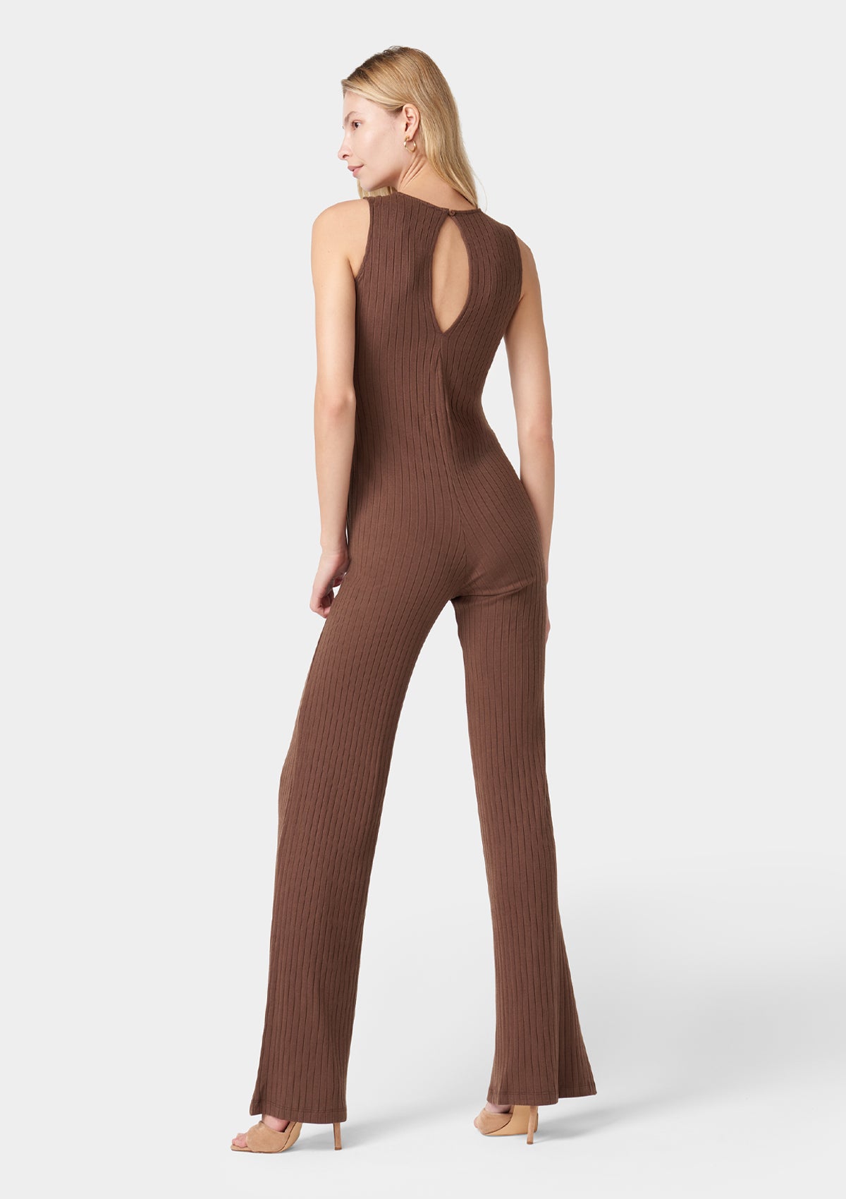 Sleek and sophisticated, this ribbed jumpsuit features leg-elongating wide hems and a keyhole opening on the back. Sleeveless design, perfect one-piece for the summertime!