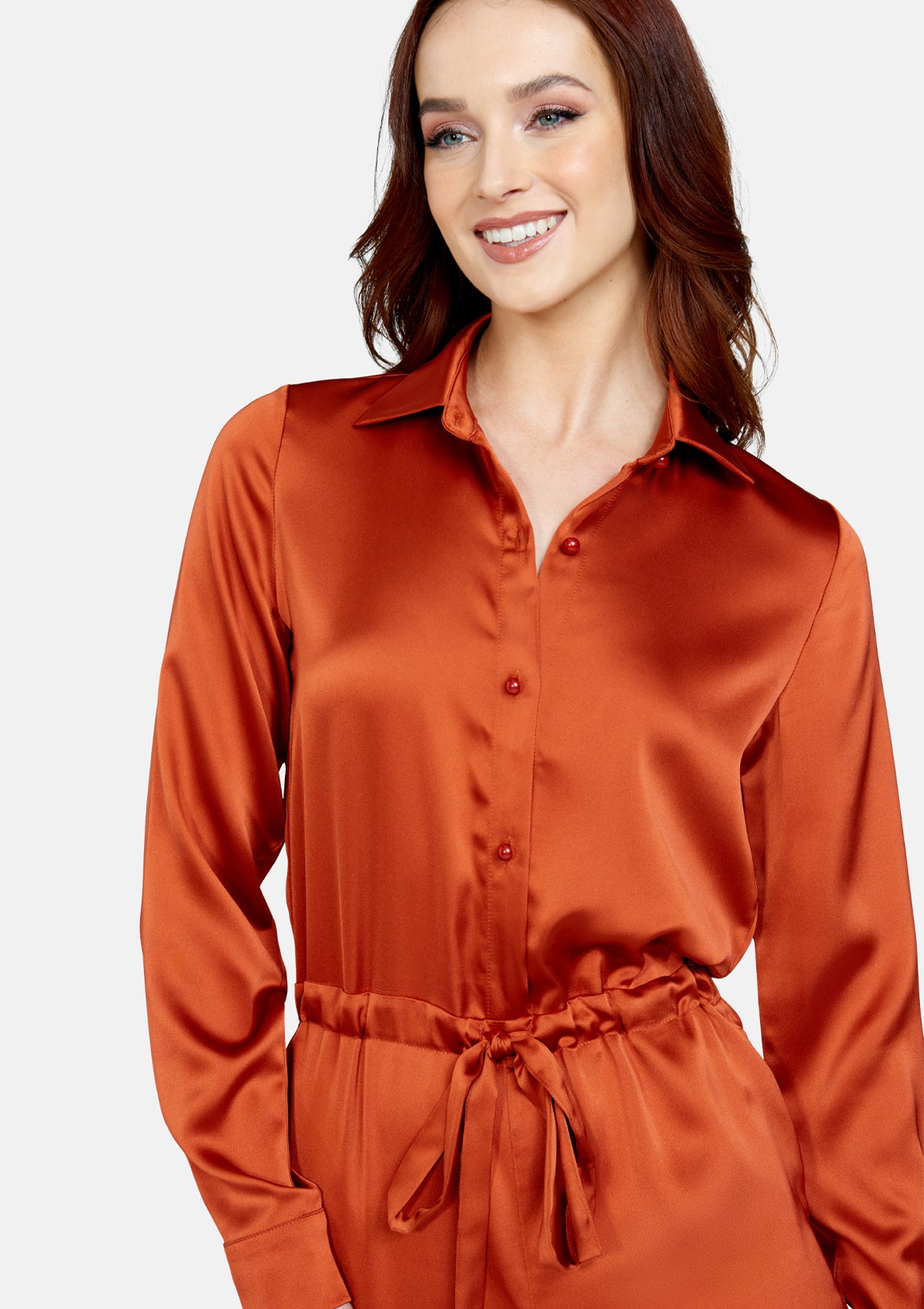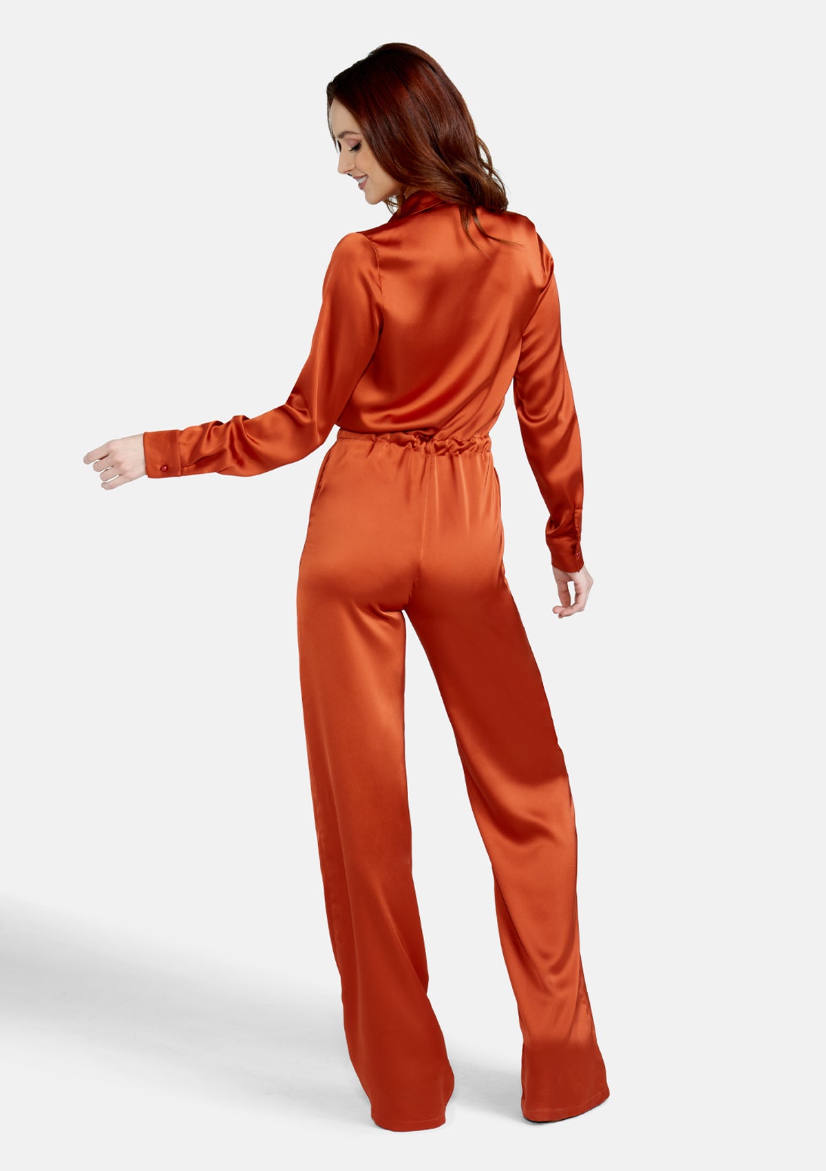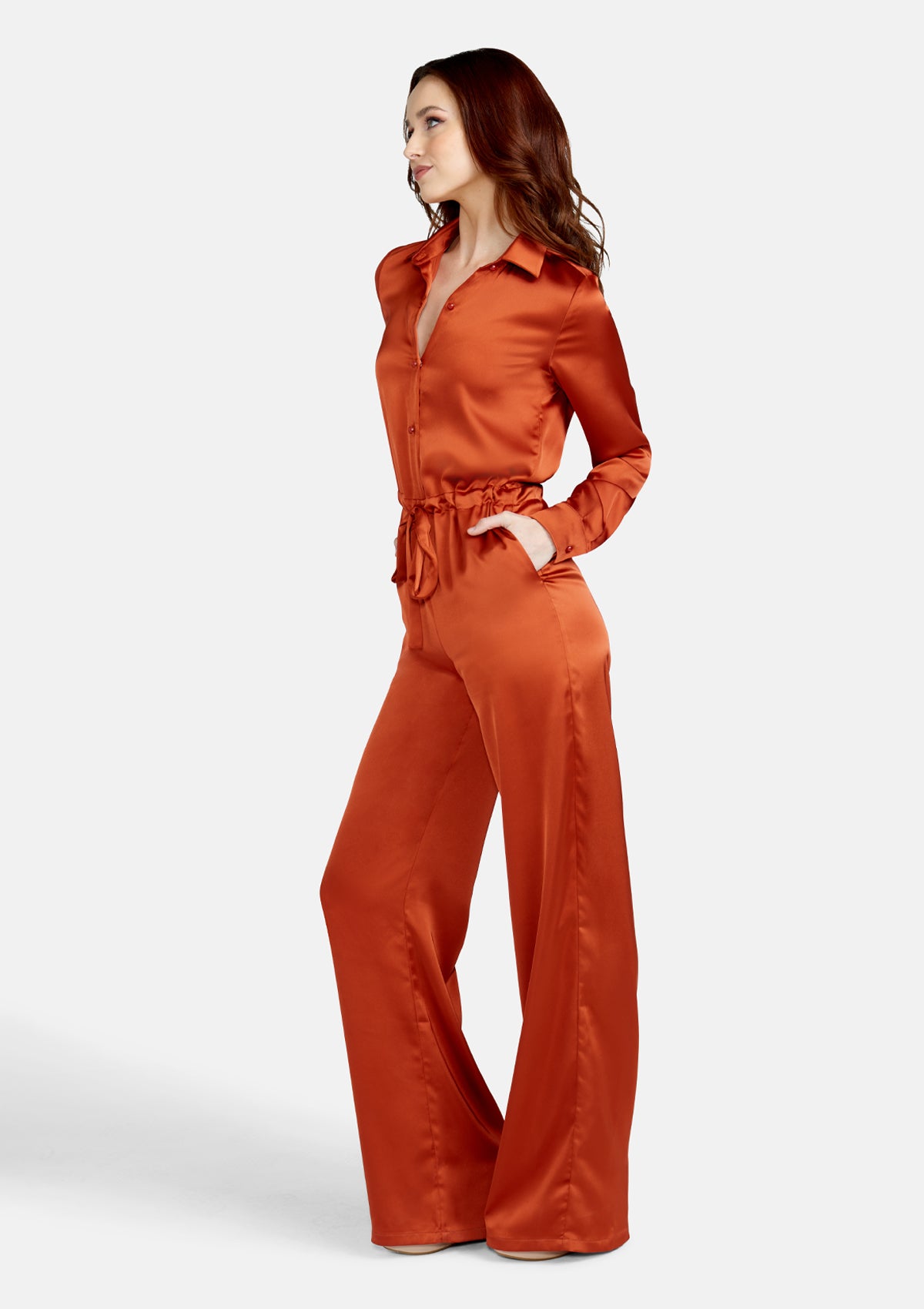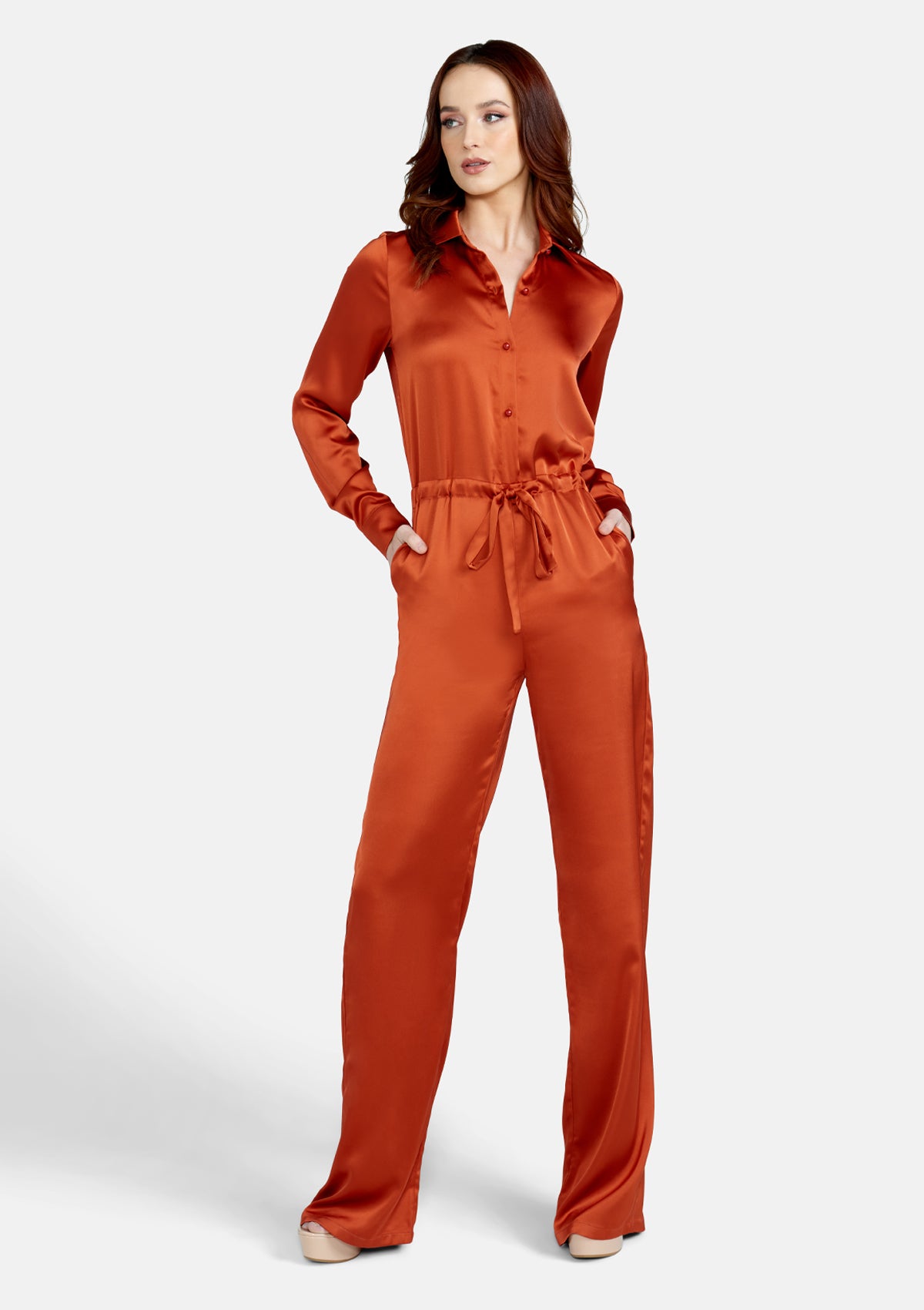 Achieve casual elegance in the Miabella jumpsuit! Featuring a luxe silky fabric with a button up detail, this jumpsuit shapes you with a flattering drawstring waist, handy pockets, and flowy wide legs.