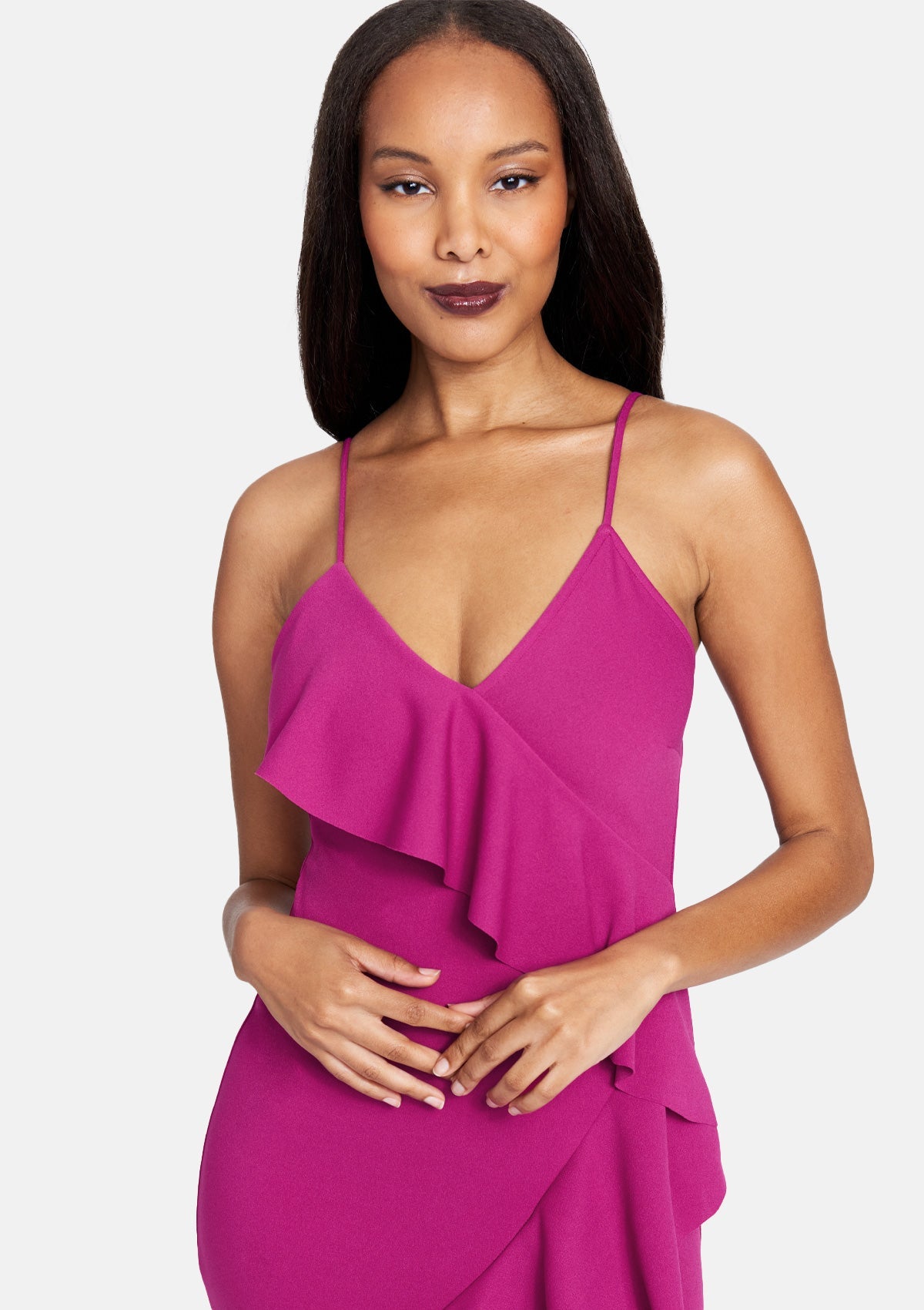 Party perfect, the Zoey midi dress features a zig-zag ruffle design and a daring asymmetrical hem that shows off your legs. Surplice cut neckline and adjustable straps frame the top of this fun dress.