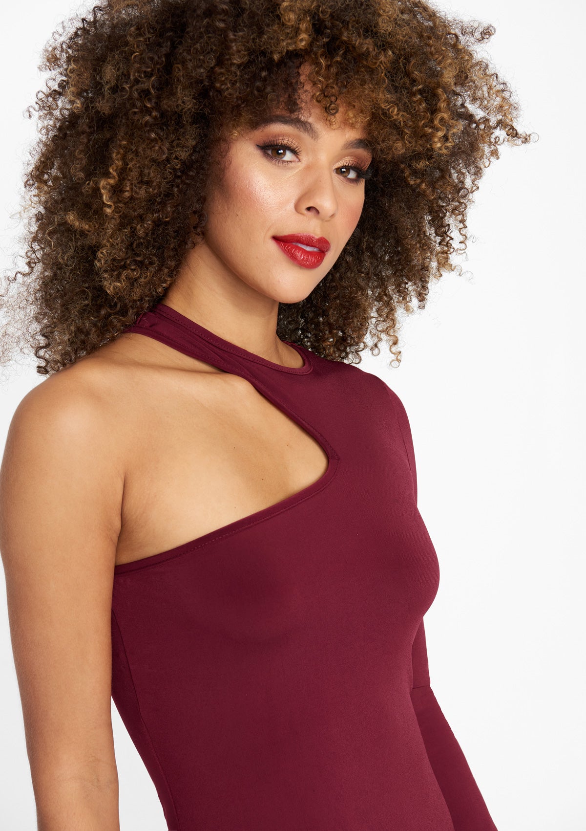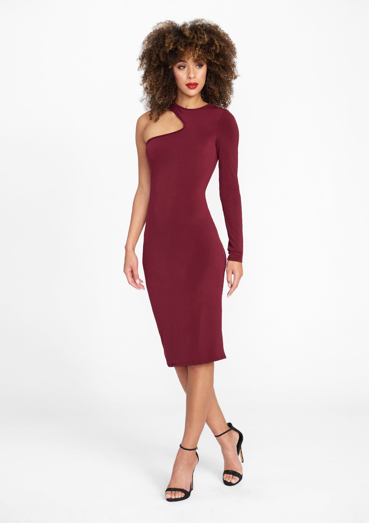 The Brooke One Shoulder Midi Dress features a long sleeve high neck cut out detail, slinky fabric, and long sleeves. An elevated look to a classic silhouette.