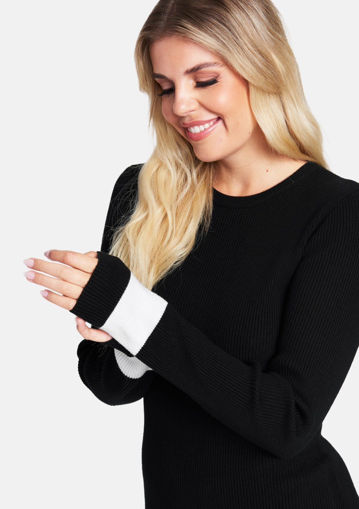 Soft and shapely, this rib-knit mini dress is topped with a sophisticated crewneck and stripe details.