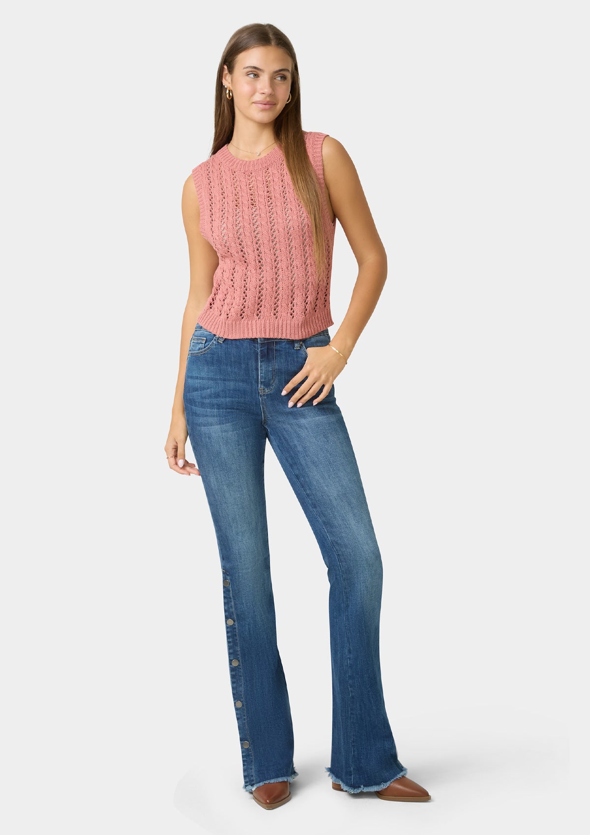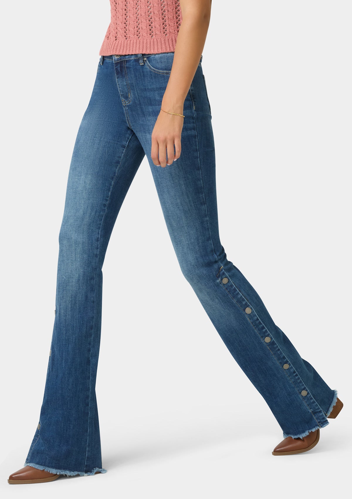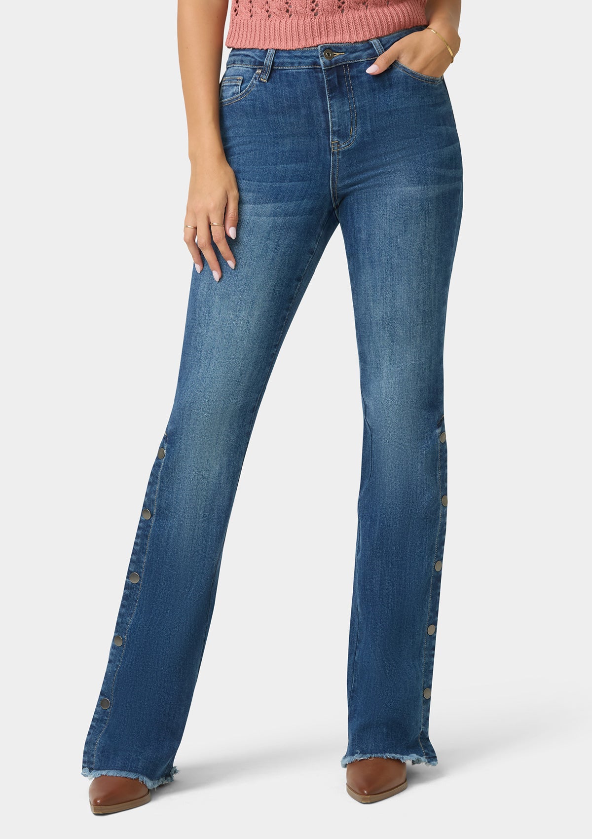 Rock the flare leg trend in these wide bottom jeans! The Celina jeans feature a high rise waistline, flared raw hems, and an edgy snap button trim detail. The wide legs balance your shape for an alluring silhouette.