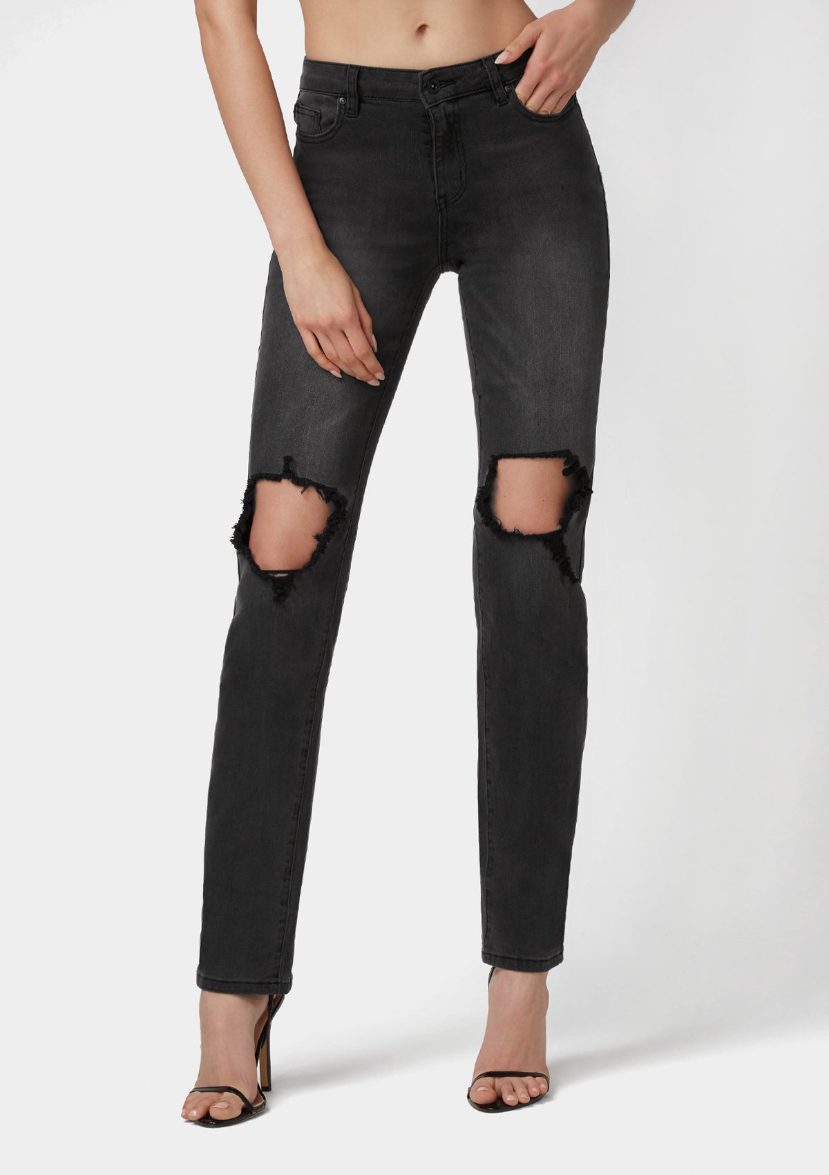 This flattering high-rise and flare leg jeans make your legs look miles long. The Cindy jean features exposed button closure, whiskered and faded wash, and distressed details for a modern update. With just the right amount of stretch, these jeans will satisfy your 70’s disco fix.