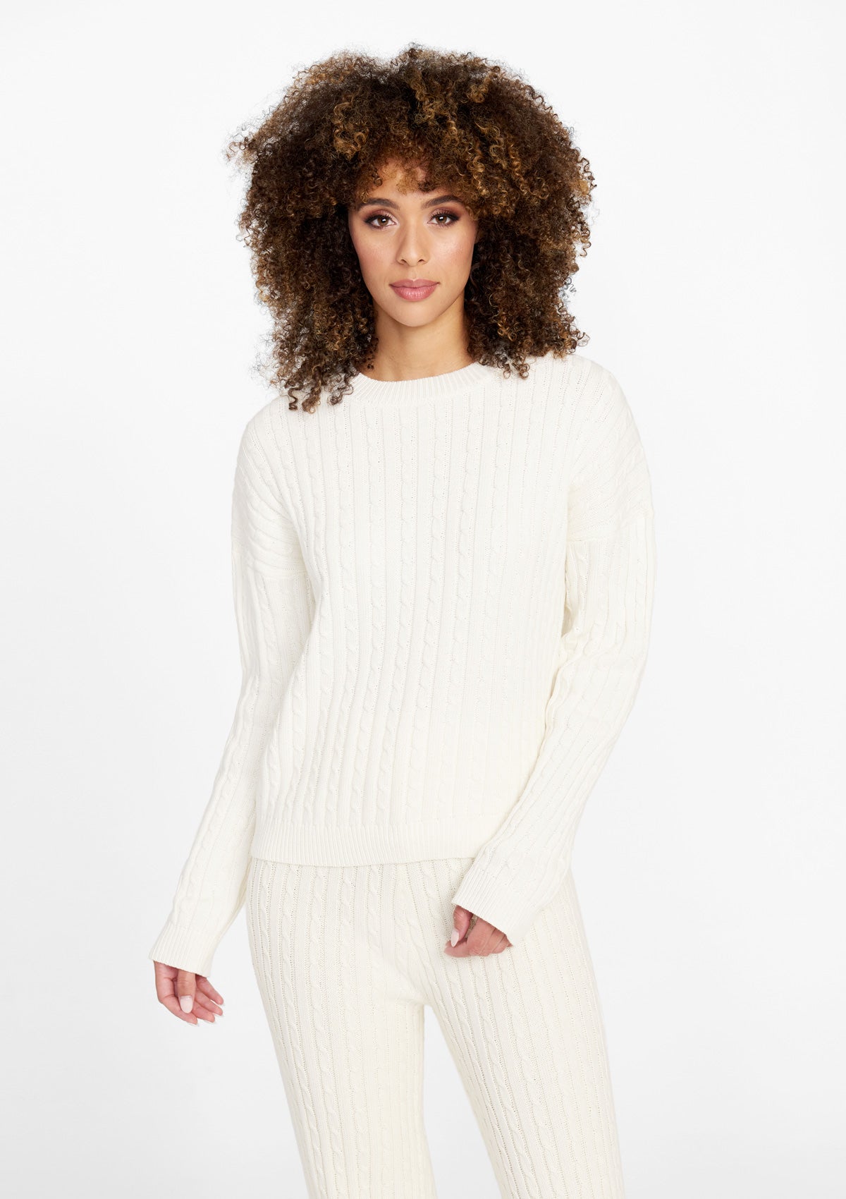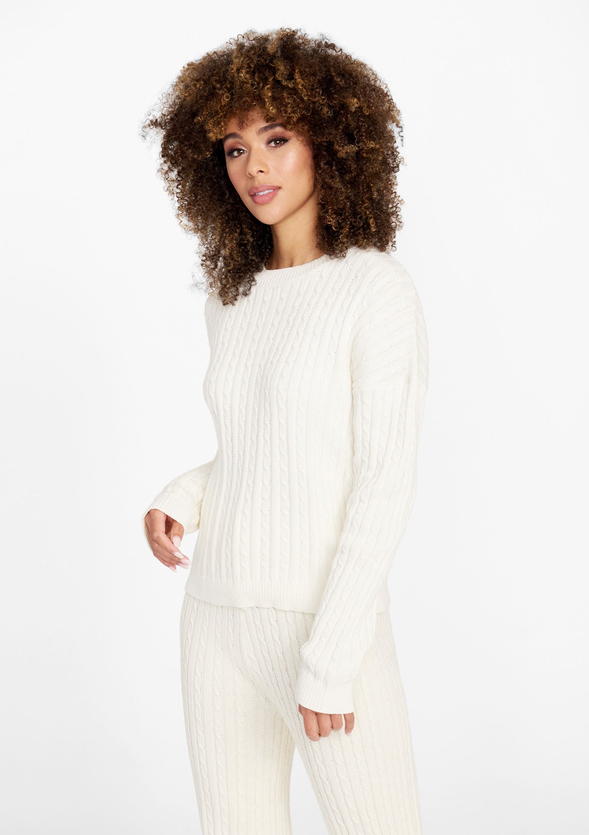 Start a head-to-toe cable-knit outfit of your dreams with this easy-fitting comfy sweater! The Dakota cable knit sweater features a medium-weight material, round neckline, and long sleeves. Pair this with the Dakota Cable Knit Pants for a coordinated cozy look!