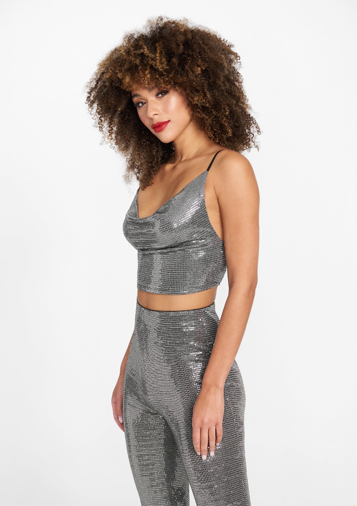 Be sure to sparkle at your next holiday party with the Donna Sequin Top! Sparkling silver sequins, atop a mesh overlay. Cropped cami top with adjustable satin straps, a cowl neck, and hidden elastic back. Looking to make a statement? Pair these with the Donna Sequin Pants for a stylish and eye-catching look.