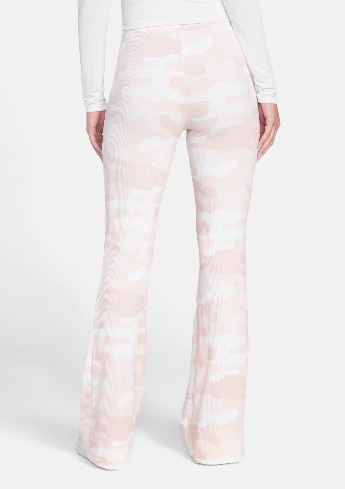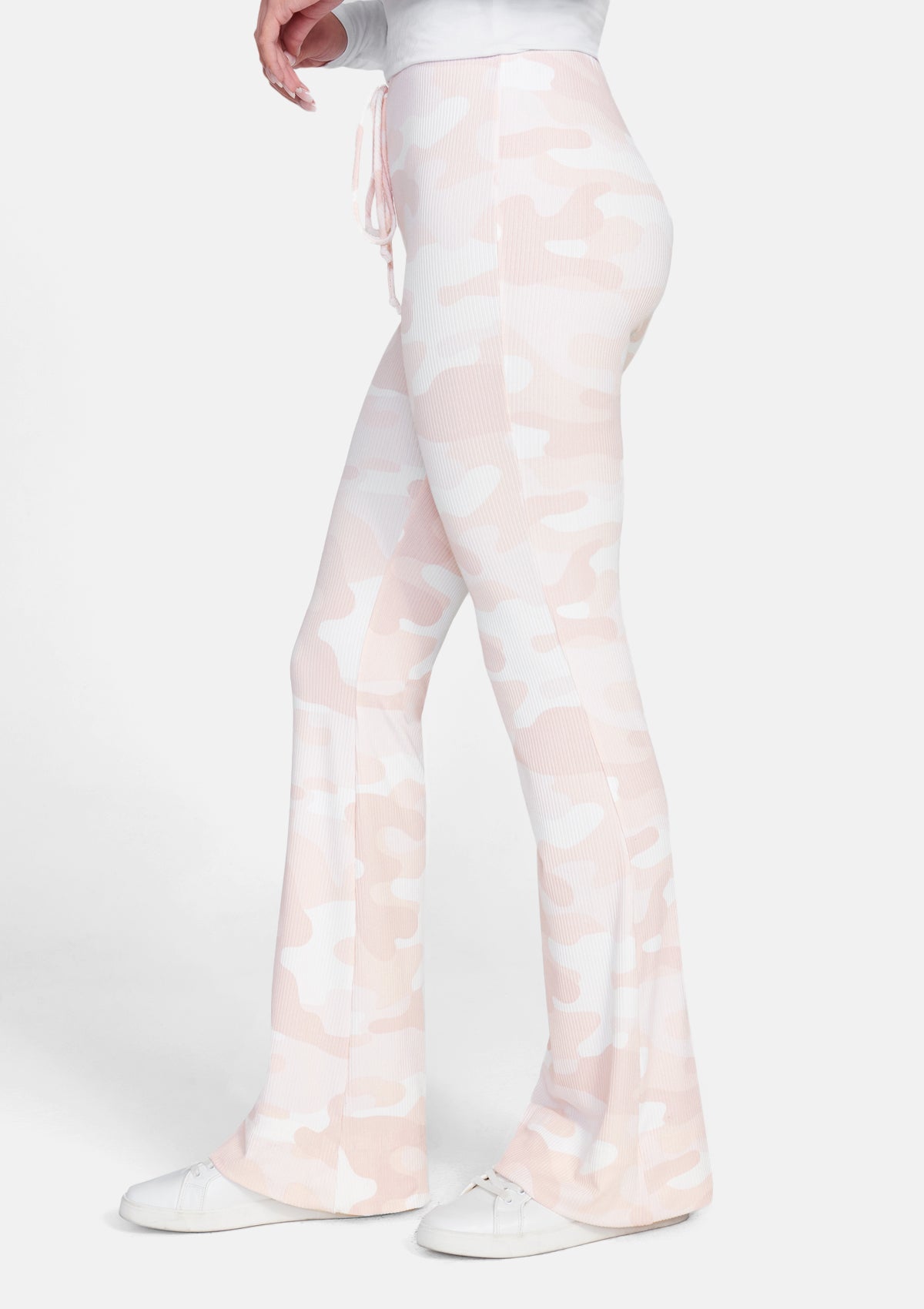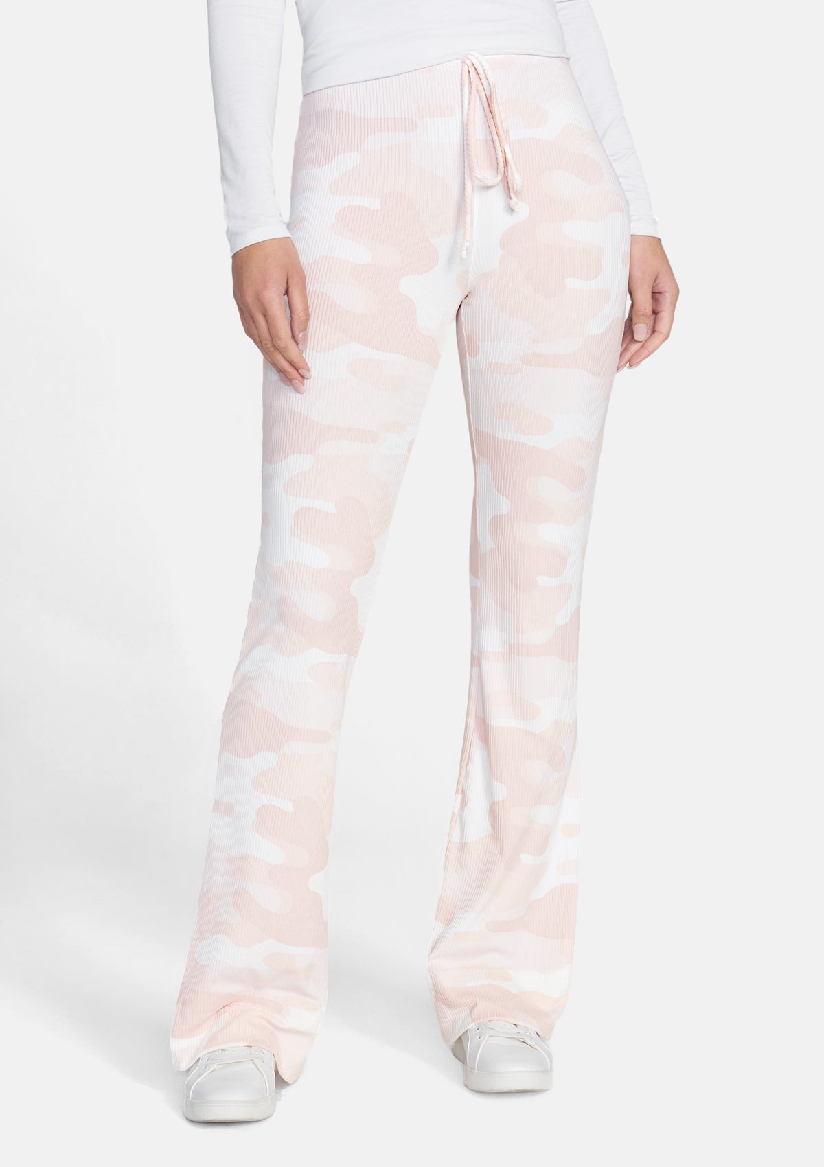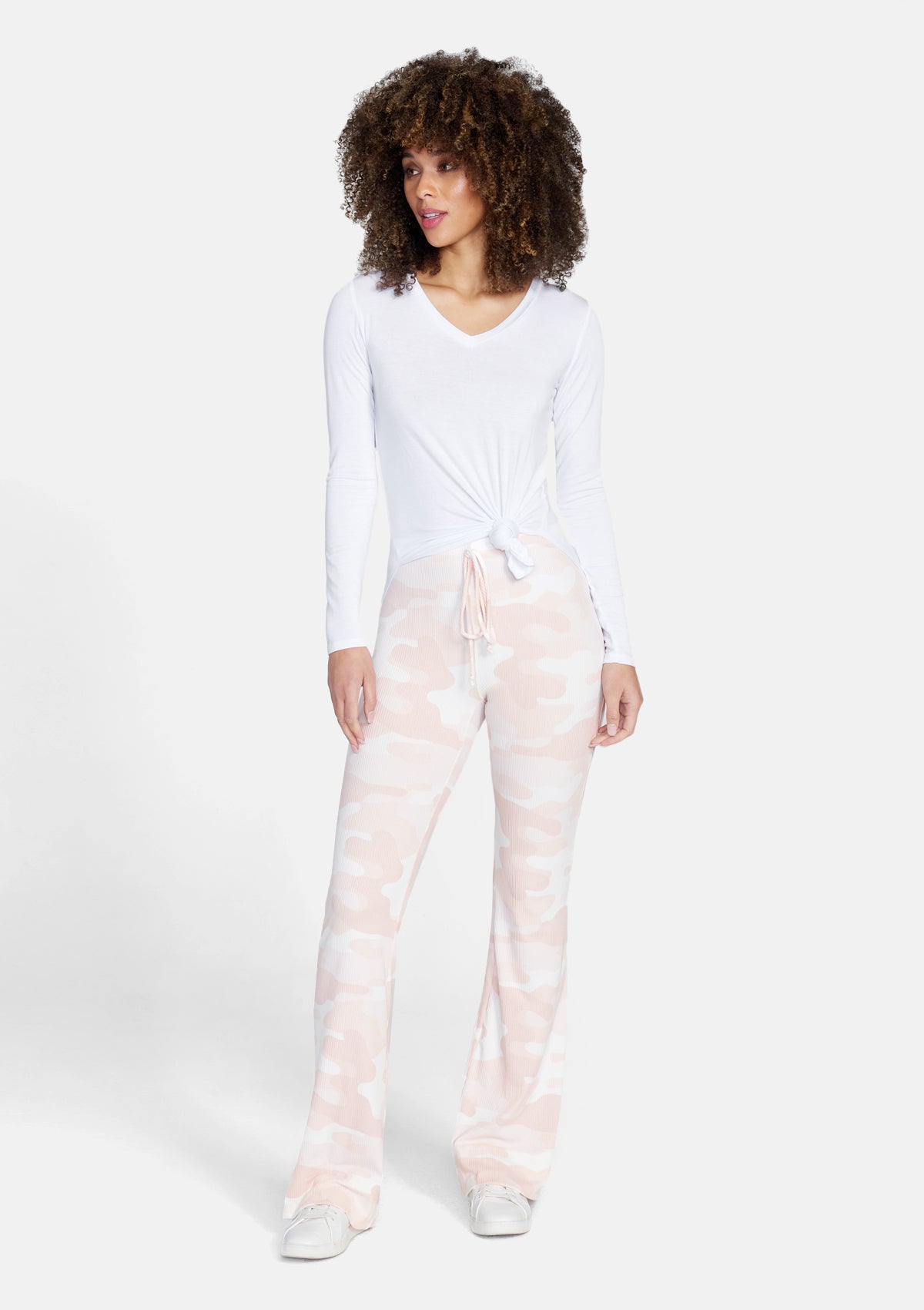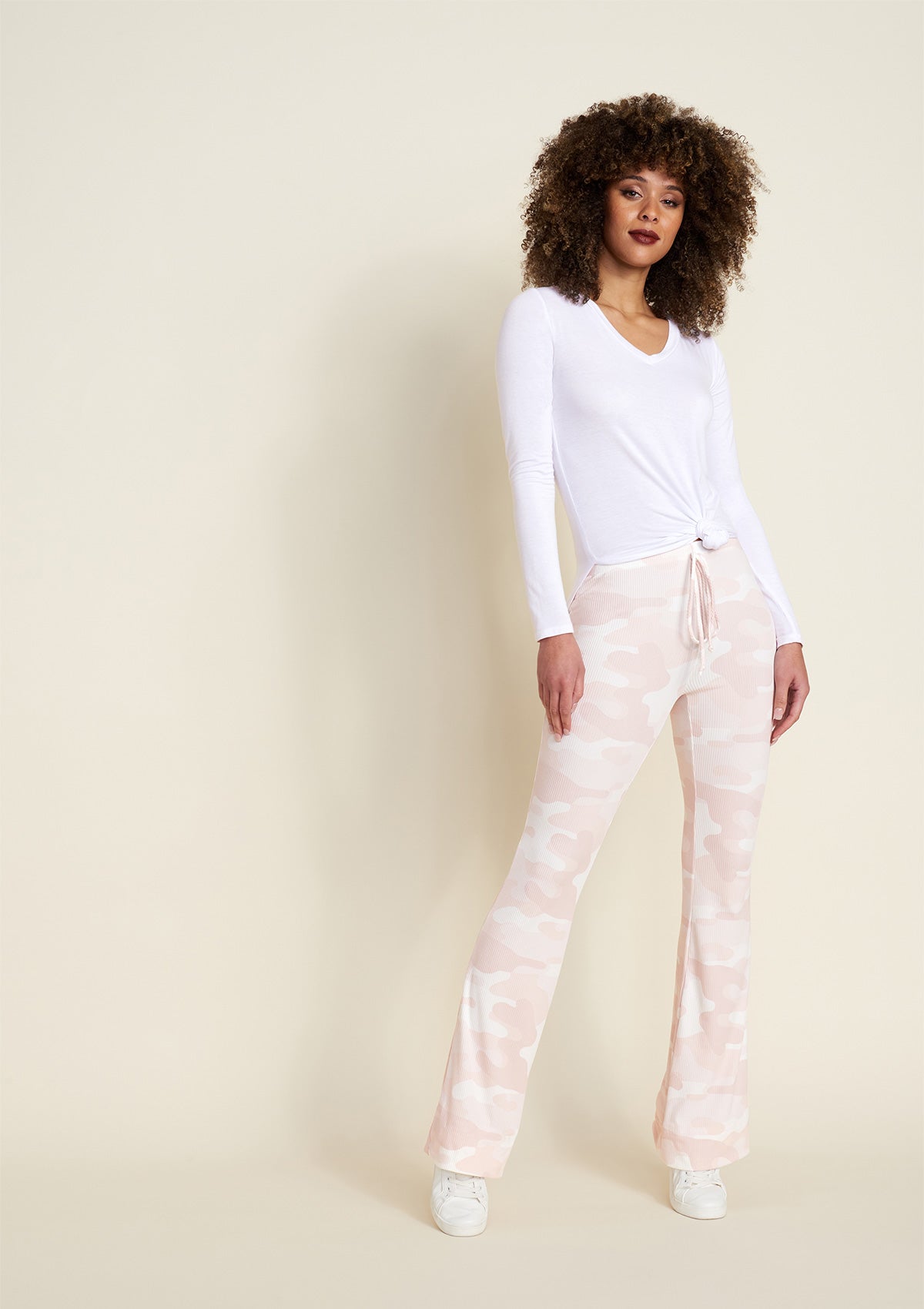 Lounge in style. Elana features a lightweight rib knit fabric, faux front tie and flare leg.