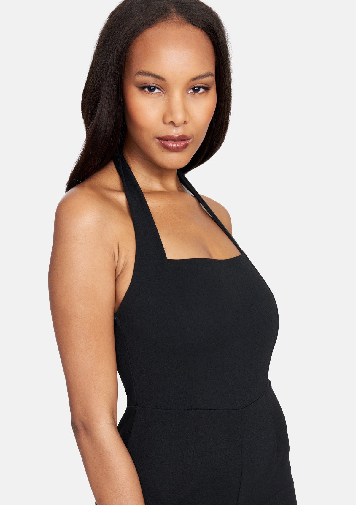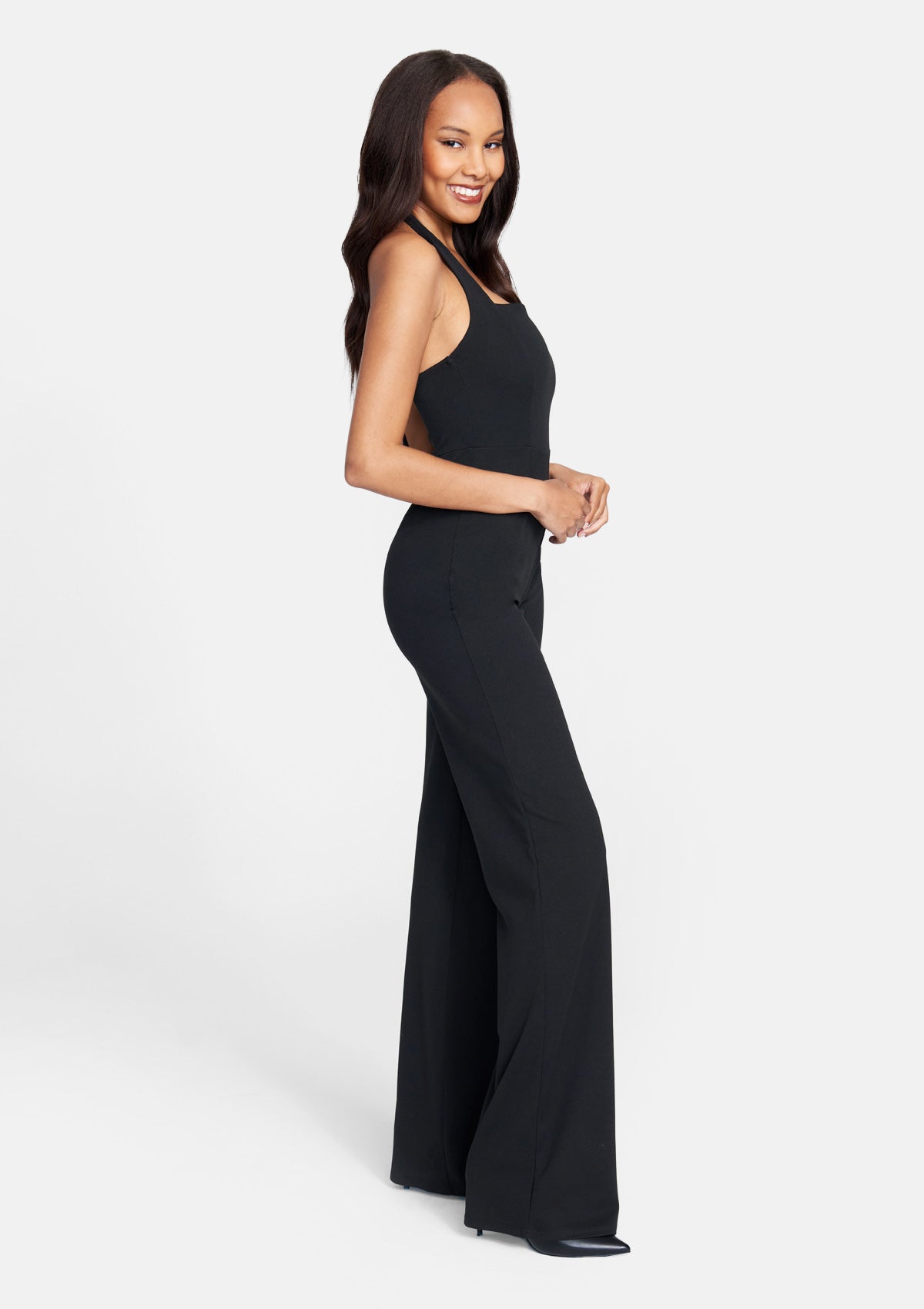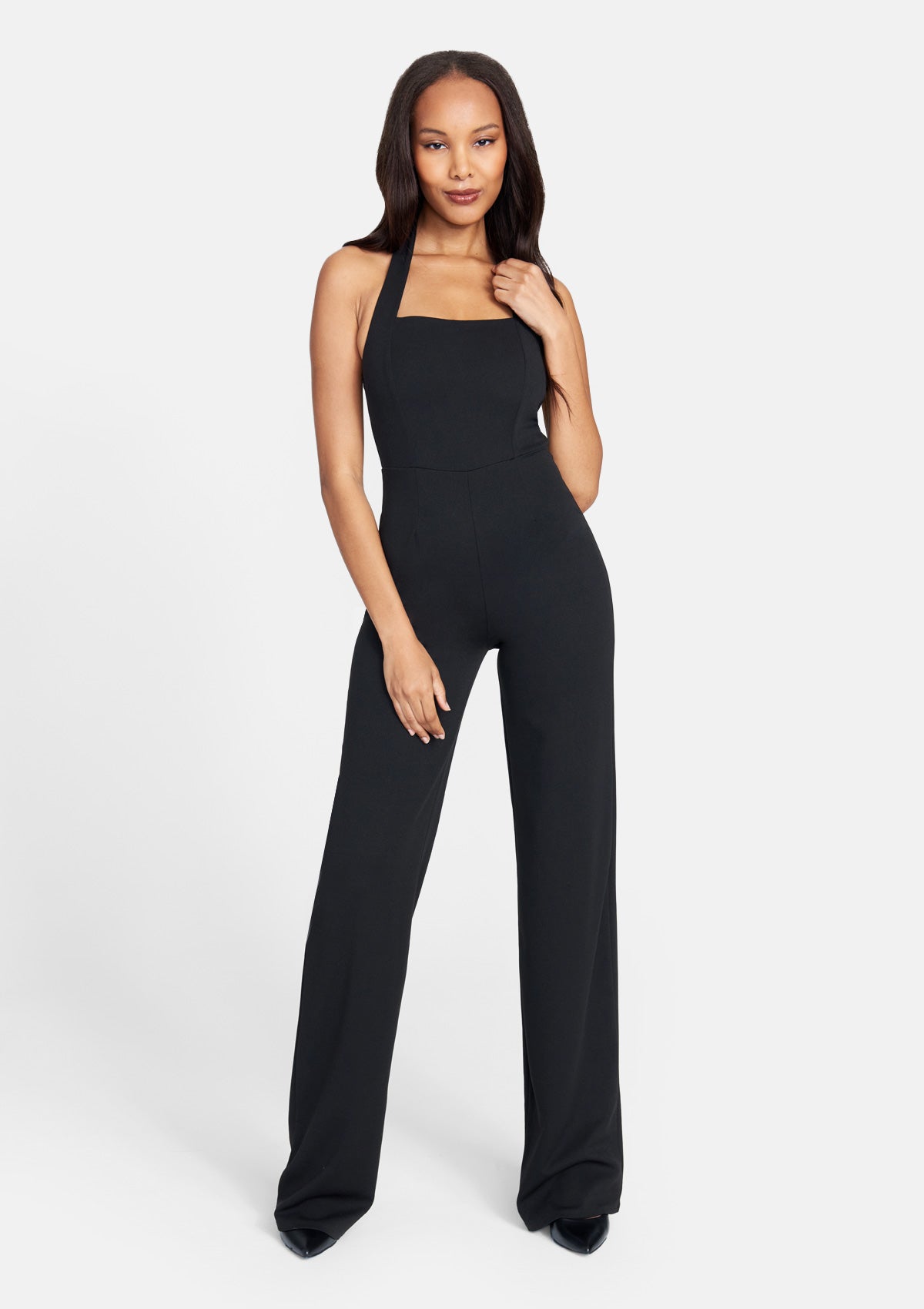 Attend a summery soirée in the Fiora jumpsuit. Featuring wide leg hems and a halter back detail. A straight neckline and fitted bodice sophisticates this look.