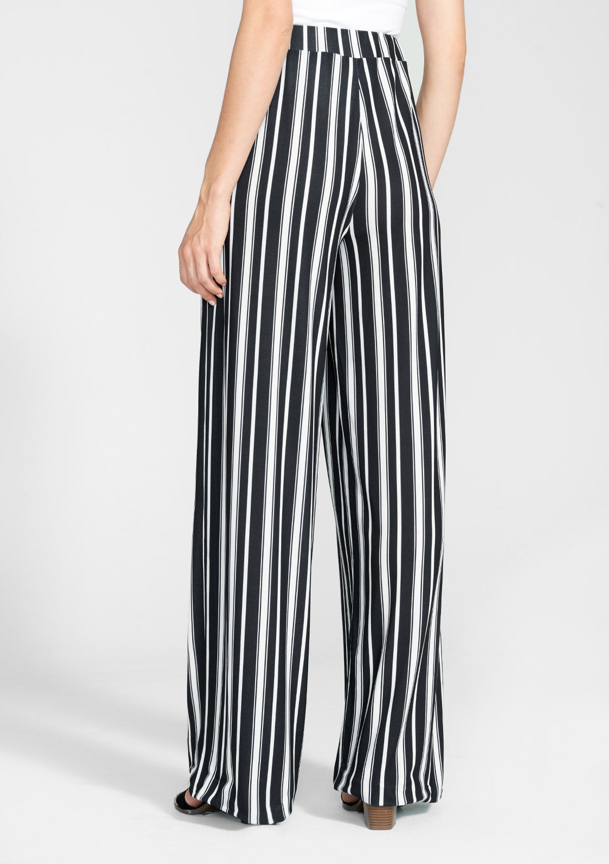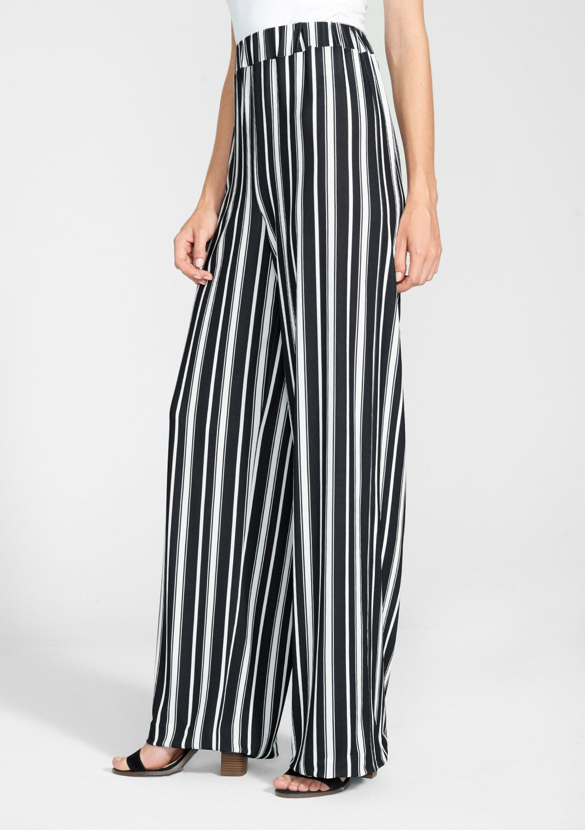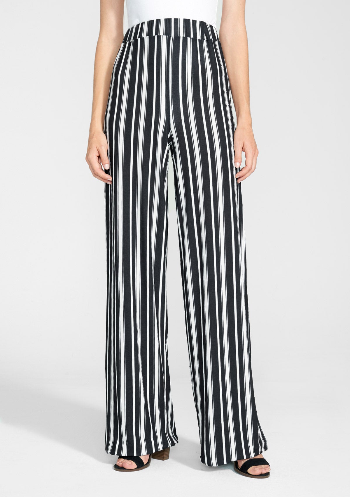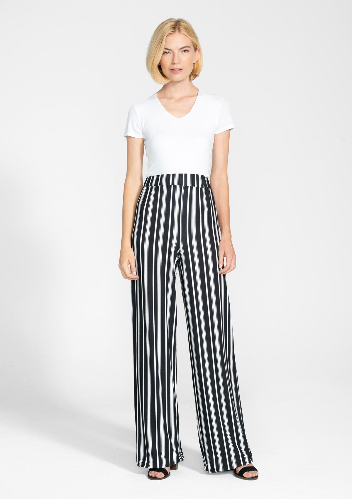 The Lucca pants feature a high rise elastic waistband with a flowy wide leg and an all-over vertical stripe print, creating an effortless look.