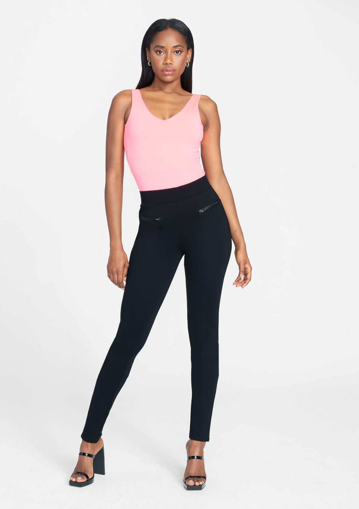 Our tall dressy ponte pant is built with 4-way stretch double knit fabric that features a clean matte finish. We added a full front pintuck detail down the legs and faux front zipper pockets and usable back patch pockets.