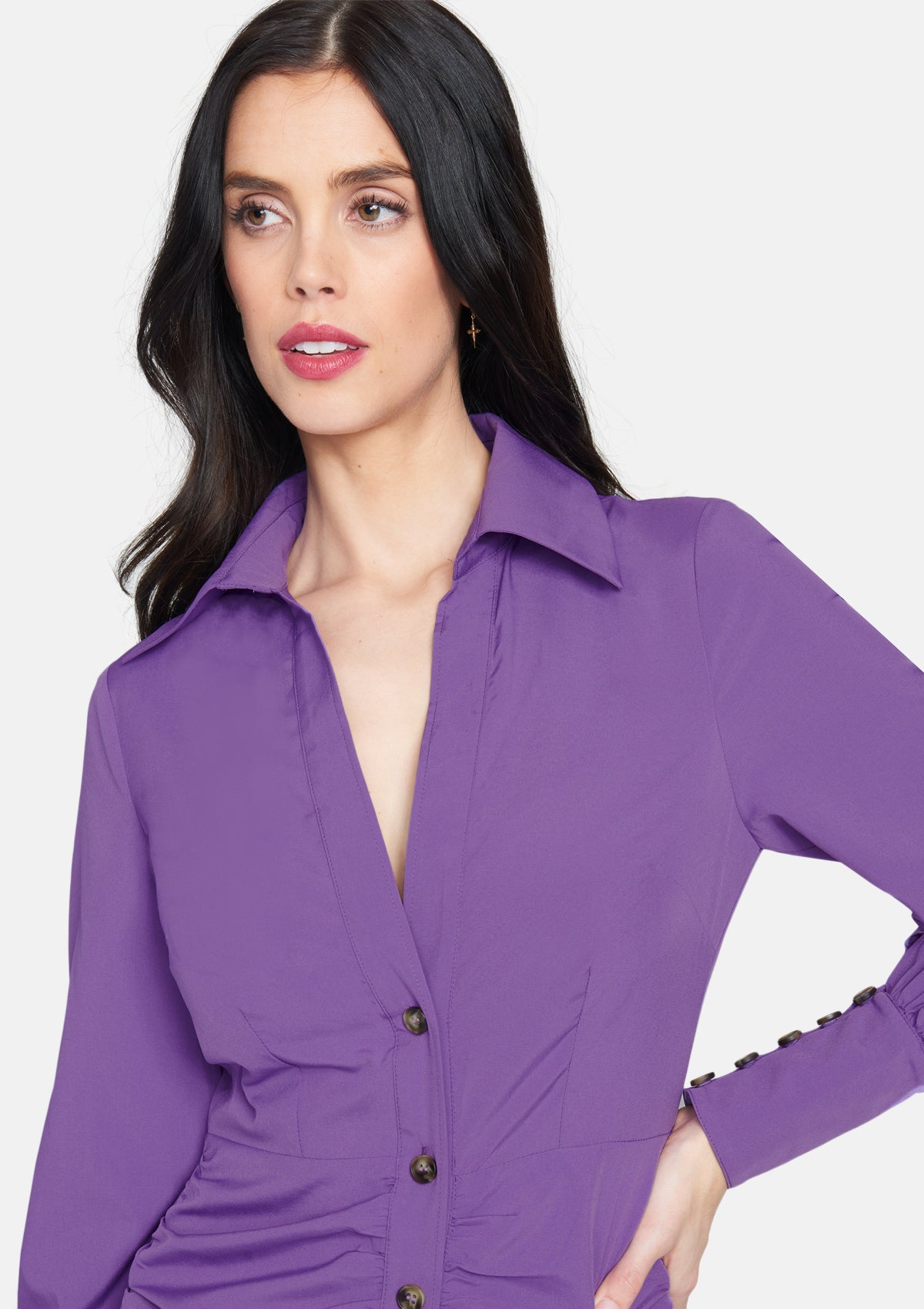 Rows of ruching shape this close-fitting dress. The Namilla mini dress features a button front detail, topped with long sleeves and a perky polo collar. Cute little number for your next occasion.