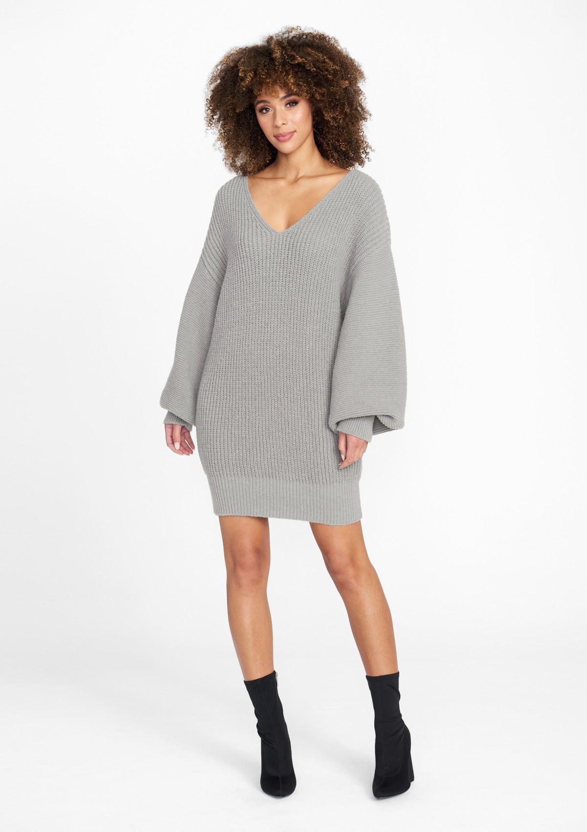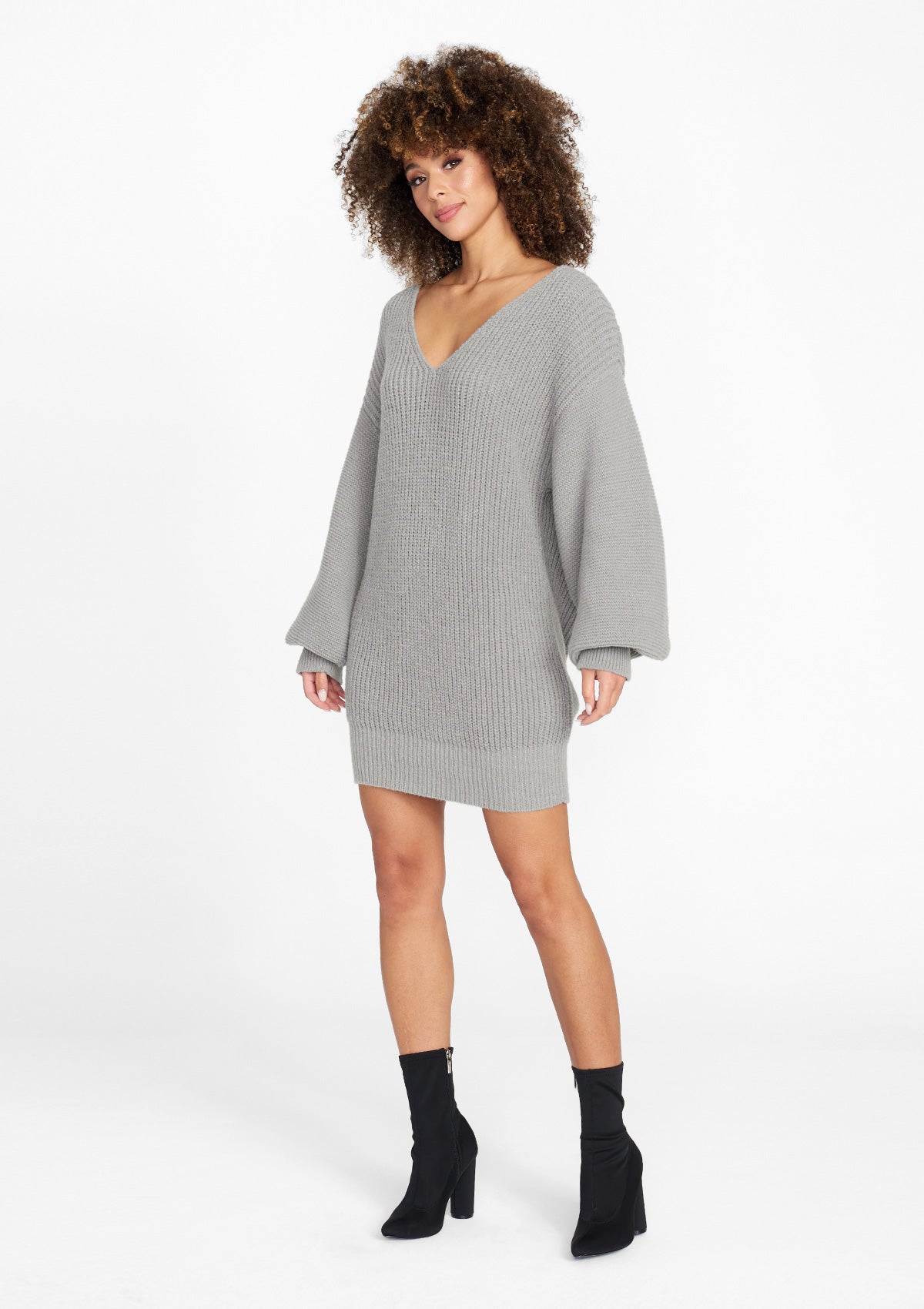 A chunky cable knit brings cold-weather comfort and style to a loose-fitting sweater dress. The Paige sweater dress features slouchy puff sleeves and a v-neckline, full of warmth and coziness.