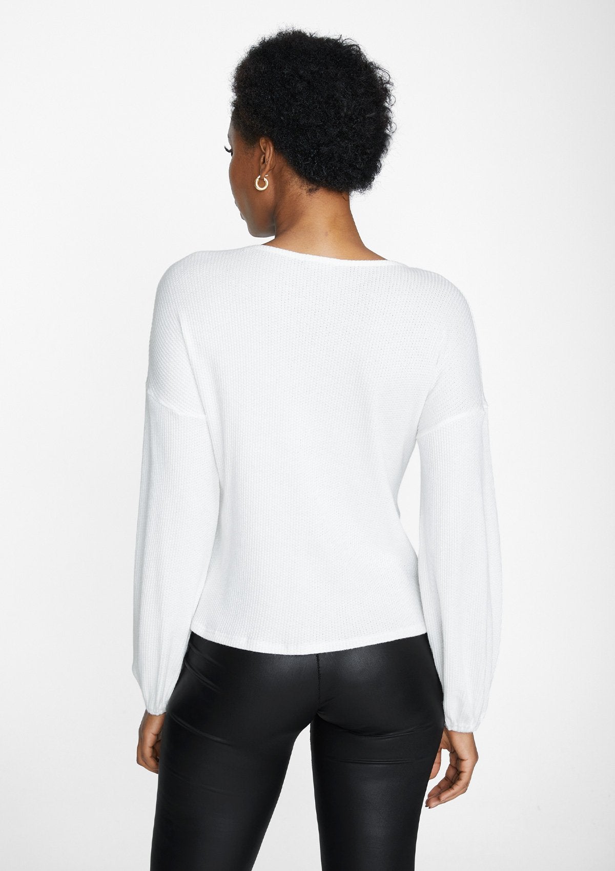 The Roxy ruched sweater features a soft ribbed knit fabric, a sexy v-neck and long fitted sleeves. An adjustable ruched drawstring adds some drama to this look.