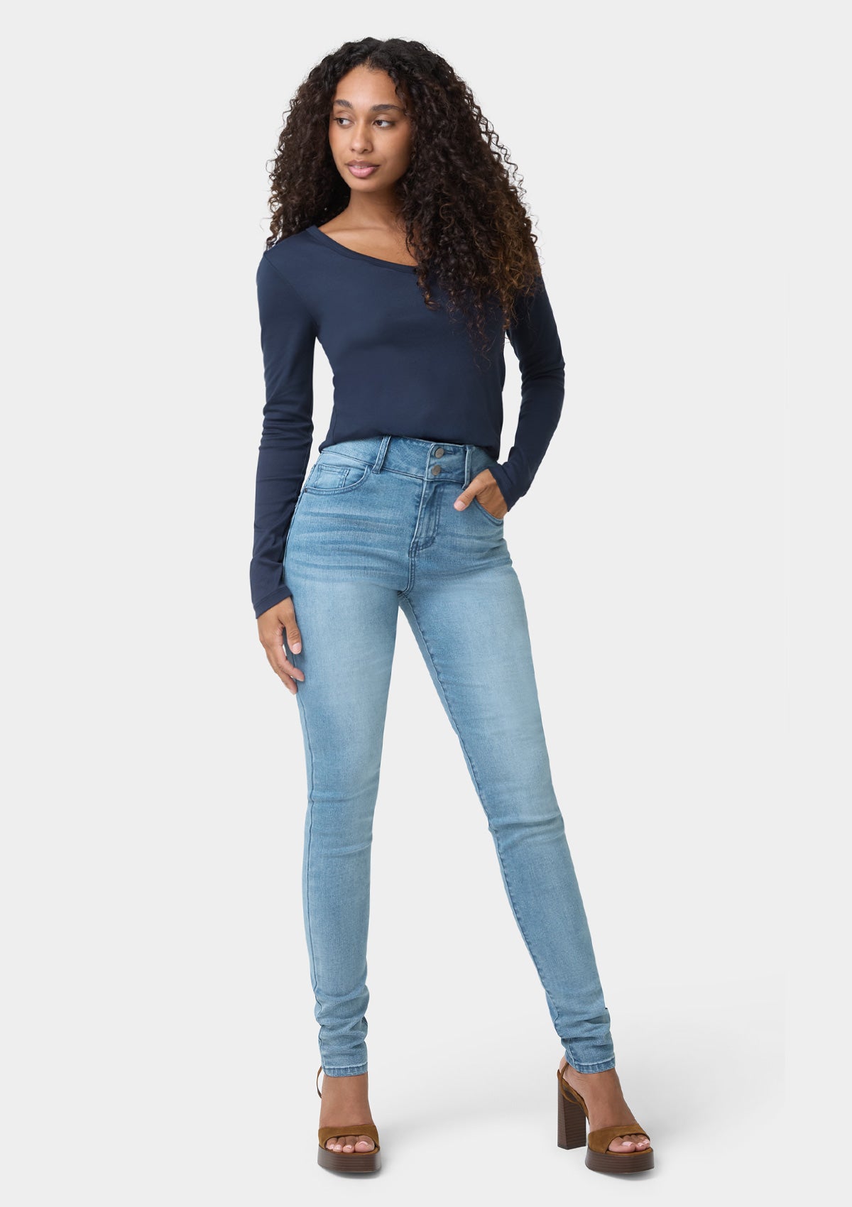 The Sabrina high rise sculpting jeans feature a flattering silhouette, a 2 button closure, and a 5 pocket design. This stretch denim fabric lifts and sculpts you into shape while enhancing your curves.